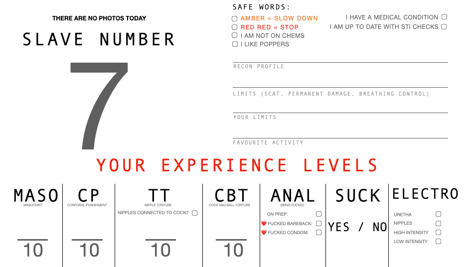 You are given the above sheet where you can state your experiences, limits, and preferences. This is displayed around your neck or on the wall.